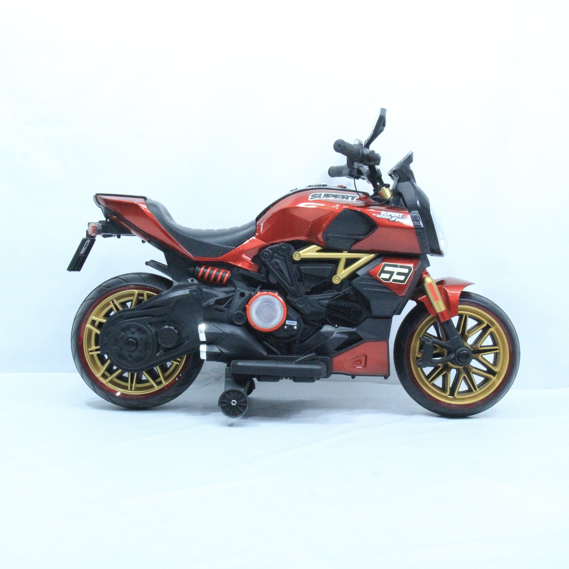 Crafted from durable plastic with a strong metal frame, this electric motorcycle is built for stability and longevity. The glossy red and black body, accented with golden details, gives it a premium sports bike look.