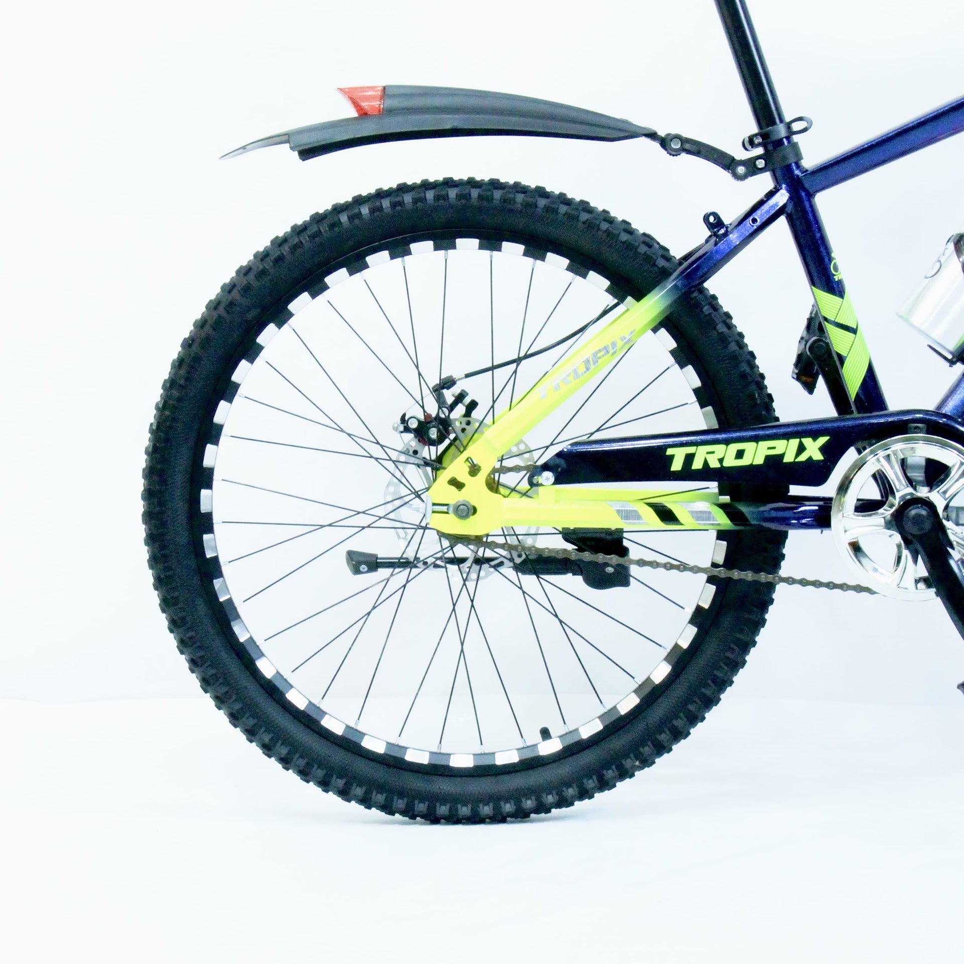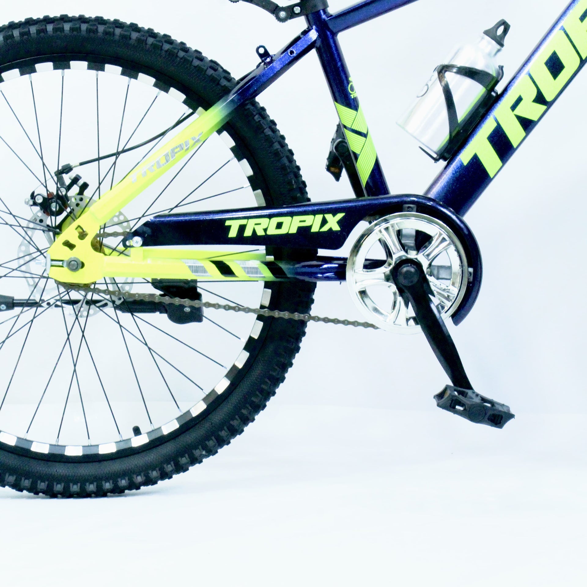 Built with a lightweight yet sturdy alloy frame, the TROPIX 240001 ensures durability without compromising agility. The dual-tone blue and neon green color scheme gives it a bold and sporty look, while the ergonomic geometry promotes a comfortable upright riding position, reducing fatigue on long rides.